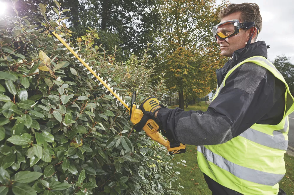 Lightweight, compact cordless hedge trimmer with dual-action laser-cut blades. Suitable for medium to large hedges. Features wraparound handle for added safety. Battery and multi-volt charger included.