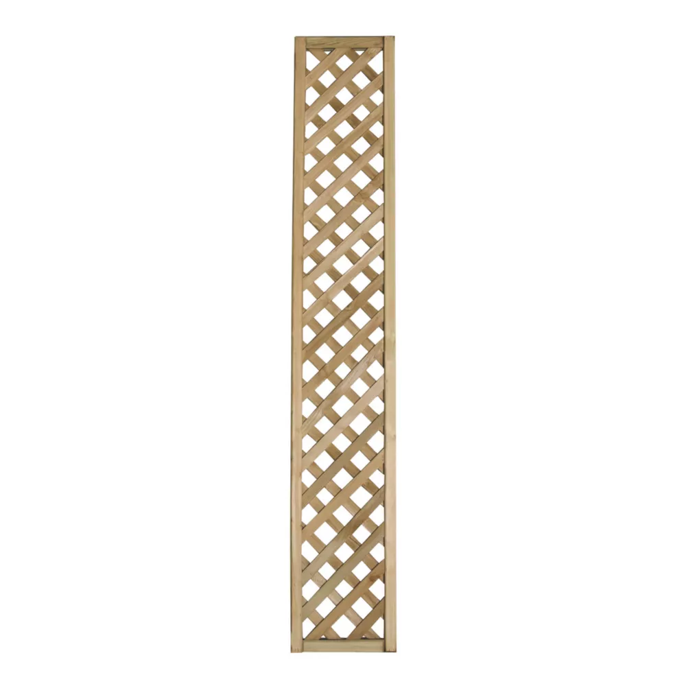 Pressure-treated decorative trellis with an attractive diamond pattern. Features square-edged, smooth-planed battens that are 6mm thick and 30mm wide. Battens are overlaid and mounted in a substantial rebated perimeter frame (also smooth-planed). Designed primarily for mounting to an external wall, or fence, to create a garden feature that can support climbing plants.