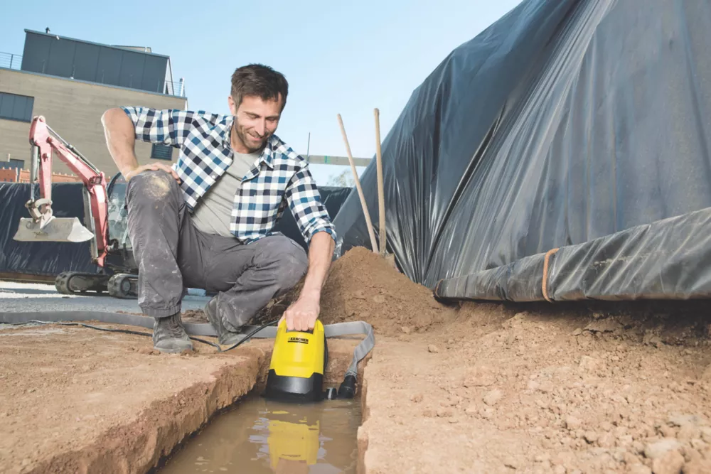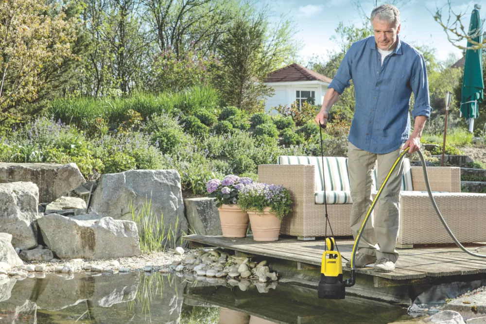 The submersible dirty water pump has a motor housed with a ceramic slide ring and oil chamber for longevity and has a capacity of up to 166.67Ltr/min. Pumps water with dirt particles up to 20mm in size and has an optional pre-filter to protect the pump impeller from larger dirt particles. A float switch which turns the pump on and off according to water level, protecting it from dry running. Fixed to a rail, the float switch can be adjusted vertically to enable water to be pumped out at a lower level, down to a residual water level of 25mm. Quick and easy connection of 1¼” hoses assured with Quick Connect connection thread. Not suitable for continuous use in fish ponds.