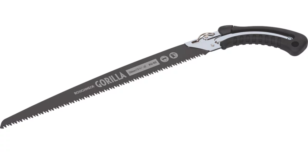Ergonomic pistol-grip design with a rubber palm grip over a solid steel body. Quick-release blade for easy change and impulse-hardened, triple-ground teeth which are spaced for aggressive cutting of wet or dry wood. Thin, PTFE-coated blade cuts on the pull stroke, making it less likely to jam when cutting through thick branches.