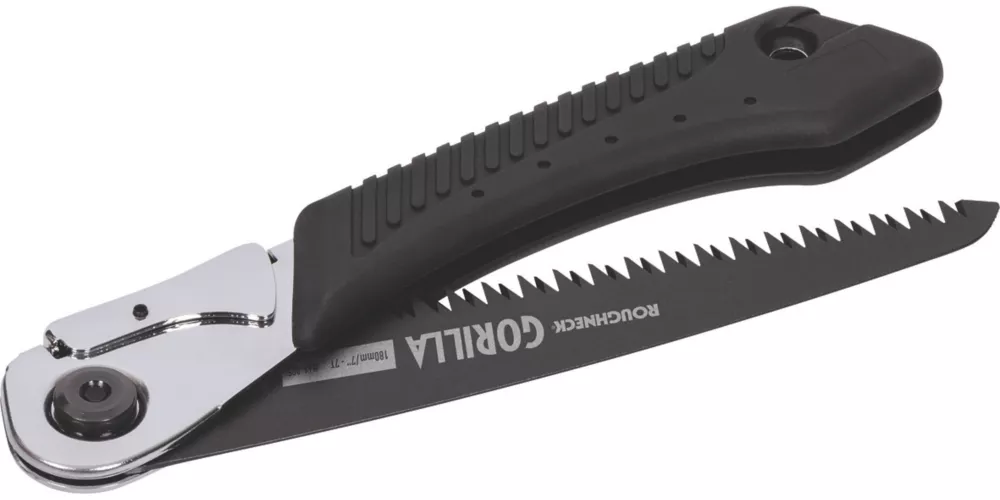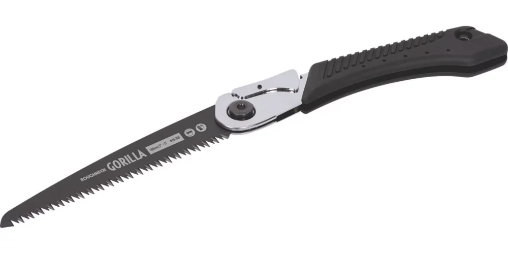 Ergonomic pistol-grip design with a rubber palm grip over a solid steel body. Quick-release blade for easy change and impulse-hardened, triple-ground teeth which are spaced for aggressive cutting of wet or dry wood. Thin, PTFE-coated blade cuts on the pull stroke, making it less likely to jam when cutting through thick branches.