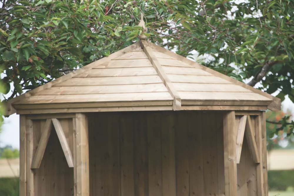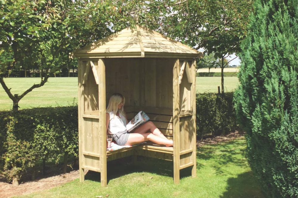 Sheltered corner arbour with integral seating for 4 adults.