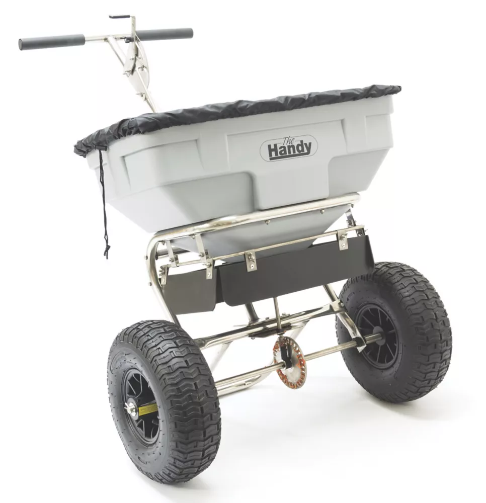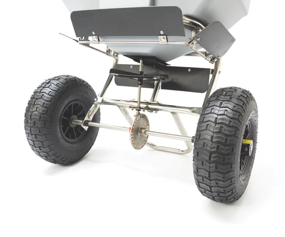 Suitable for both commercial and large-scale domestic use. Quick and efficient way to de-ice paths, driveways, forecourts and other areas. Easy to push with wide-profile pneumatic tyres that have no trouble propelling it across rough or undulating ground. Features a handlebar-mounted adjuster that facilitates precision setting of the spread-rate. Adjustable deflectors to quickly switch from pathway to open-space work. Can be used for the application of granular fertiliser. Includes a hopper screen that prevents clogging and a cover to keep the contents dry.