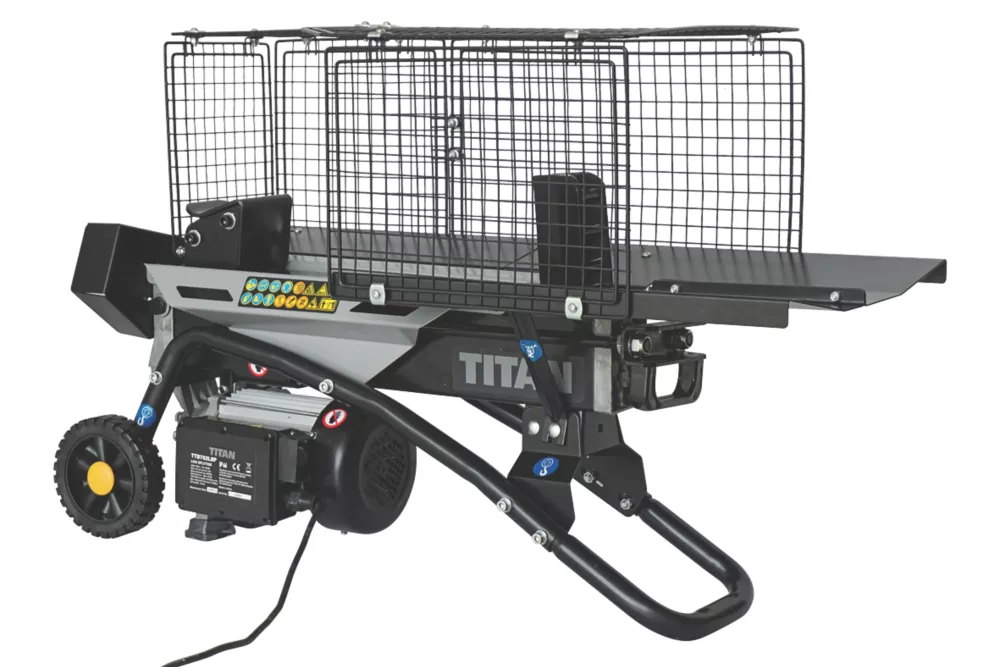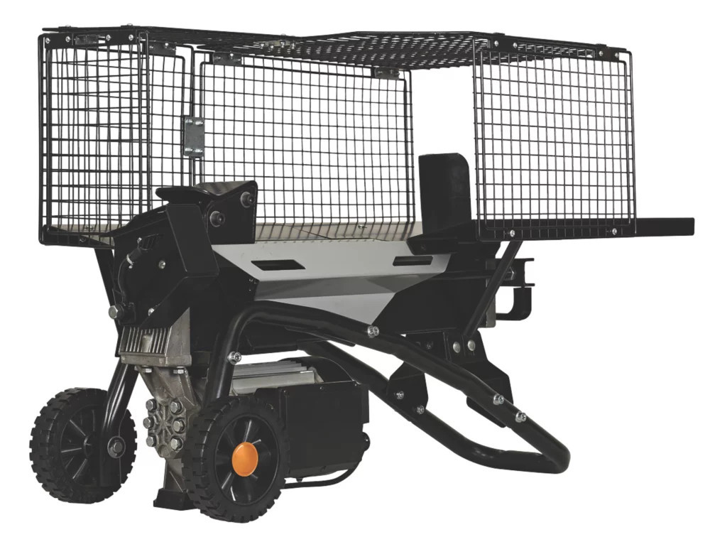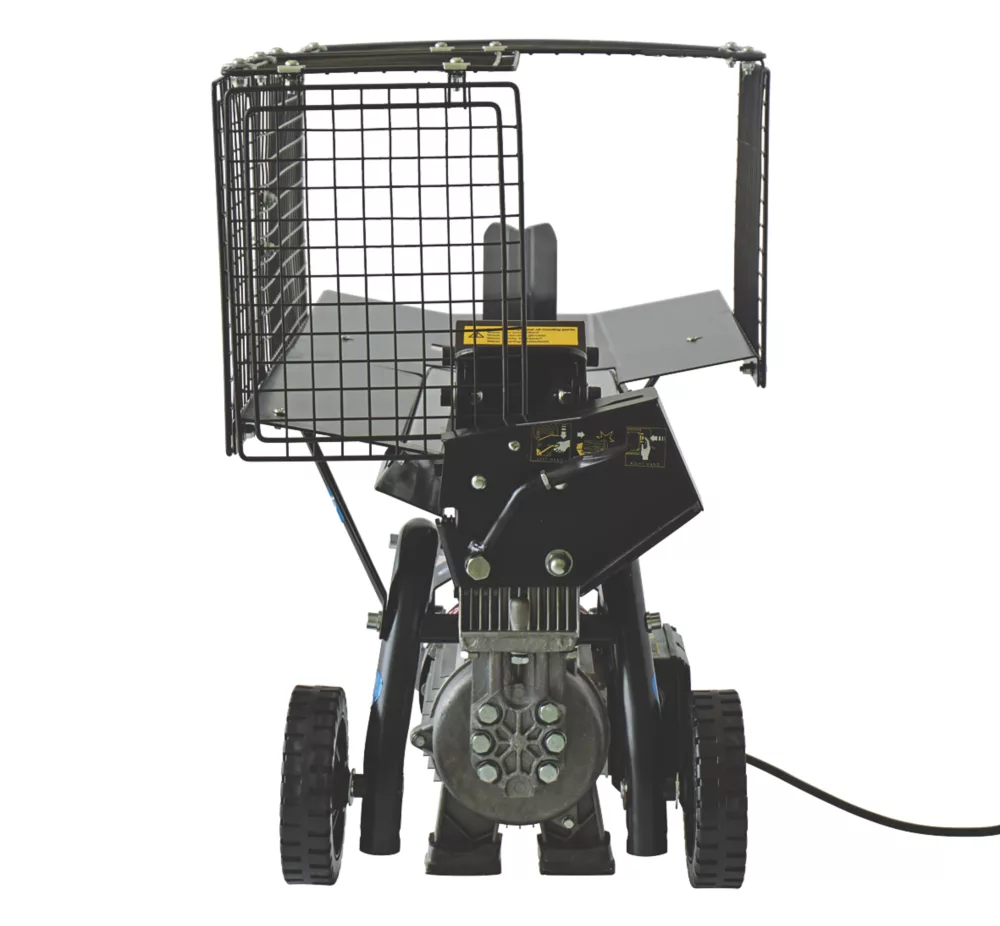 Powerful electric log splitter, perfect for residential use. Torsion-resistant steel construction. Easy to move with conveniently located handle and durable wheels. Automatically returning ram makes jobs easy for single person use, returning to the starting position once lever is released.